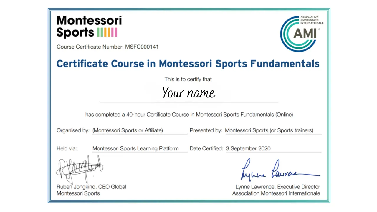 Upon completion, you receive the full 40-hour Montessori Sports Fundamentals Course certificate.