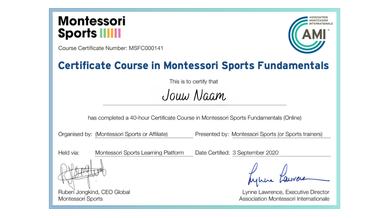 Na het voltooien van de cursus ontvang je een Montessori Sports Basis-certificaat, geaccrediteerd door AMI.